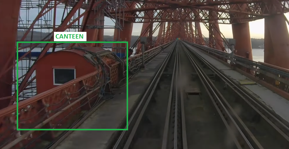 The first structure identified is a canteen. Canteens are located on the left-hand side of the tracks (eastern side of the bridge) at 0:53
