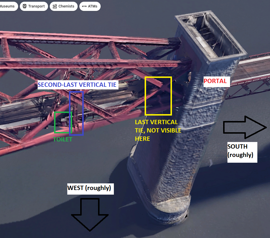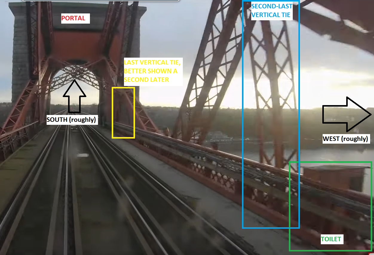 Due to the bridge’s sheer size and length, locating toilets visually, even in high-resolution photos, is challenging. It’s much easier to do it using train cab view videos.