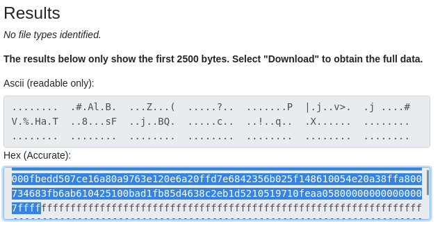 hex_data = "000000000000000fe423f8416cd042e9c0ba175ae5d0ba28ae841519043faaafe00010000fbedd507ce16a80a9763e120e6a20ffd7e6842356b025f148610054e20a38ffa800734683fb6ab610425100bad1fb85d4638c2eb1d5210519710feaa058000000000000007fff"